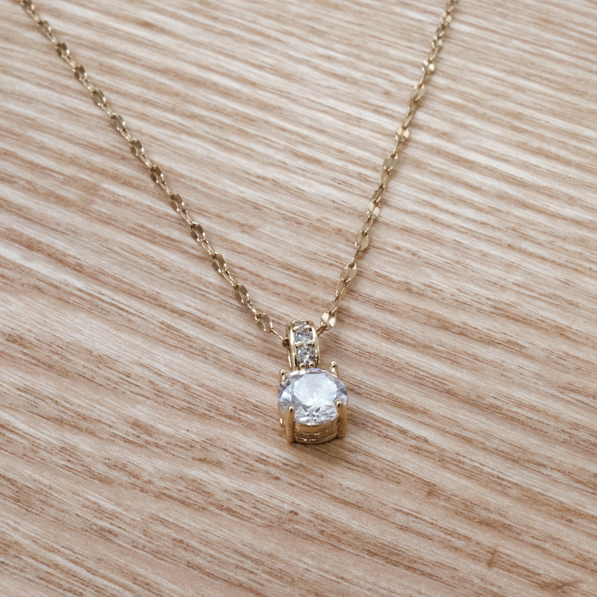 A timeless pendant necklace featuring a brilliant round-cut stone set in a sleek gold-tone stainless steel setting. The sparkling centerpiece is held securely in a classic prong mount, with delicate accent stones on the bail for an extra touch of shine. Designed to be lightweight, hypoallergenic, and resistant to tarnish, this necklace offers everyday luxury without the worry of fading. Elegant and versatile, it pairs beautifully with both casual outfits and evening wear, making it a perfect gift or a staple piece for any jewellery collection.